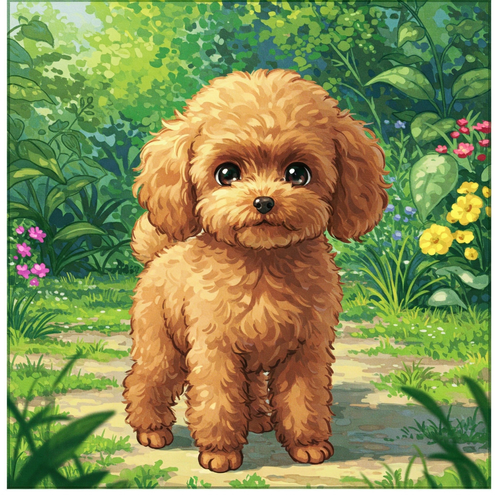 예시: "지브리 애니메이션 느낌으로, 초여름의 숲속에서 반려견과 함께 걷는 소녀를 수채화 느낌으로 따뜻하게 그려줘"