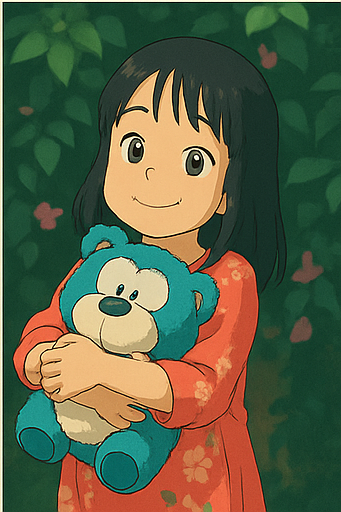 - "햇살 가득한 숲 속에서 웃고 있는 여자아이를 지브리 스타일로 그려줘"